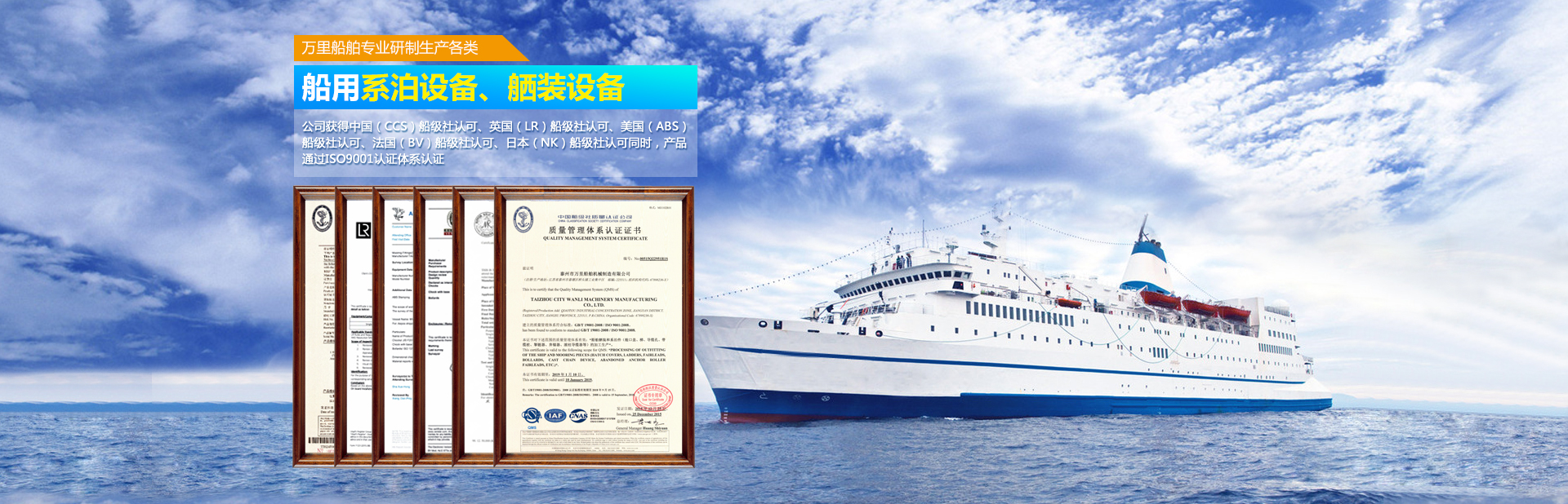 泰州市萬里船舶機械制造有限公司位于姜堰市西郊橋頭工業集中區,東臨寧靖鹽高速公路,南傍寧啟鐵路及328國道,距泰州火車站10公里,交通十分便利。 本公司是一家研制生產各類船用系泊設備、舾裝設備的專業廠家,所生產產品品種齊全、質量可靠。其中導纜器、導纜滾輪、導纜孔、帶纜樁、棄錨器、人孔蓋、導鏈滾輪廣泛應用于國內各大船廠,同時外銷日本、韓國、西班牙、意大利、臺灣等國家及地區。本公司已獲得中國(CCS)船級社認可、英國(LR)船級社認可,美國(A···